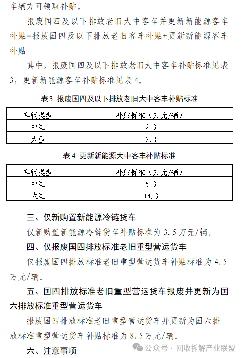 本實(shí)施細(xì)則對國四及以下排放標(biāo)準(zhǔn)老舊貨車和大中型客車報廢并更新為新能源車輛(以下簡稱“報廢更新為新能源”)的車主,僅新購置新能源冷鏈貨車、僅報廢國四排放標(biāo)準(zhǔn)老舊重型營運(yùn)貨車(以下簡稱“僅報廢國四重型營運(yùn)”)、國四排放標(biāo)準(zhǔn)老舊重型營運(yùn)貨車報廢并更新為國六排放標(biāo)準(zhǔn)重型營運(yùn)貨車(以下簡稱“報廢更新為國六重型營運(yùn)”)的業(yè)戶給予補(bǔ)貼。